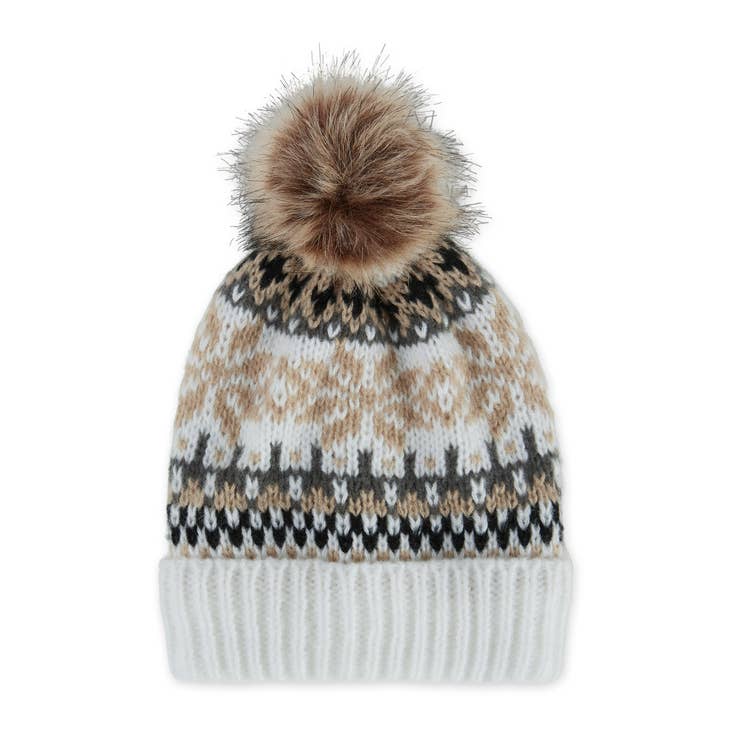 Our fair isle plush lined beanie is constructed of soft 100 percent polyester fiber and measures 12 inches tall and 9 inches wide, dimensions include a 4 inch faux fur pom-pom.