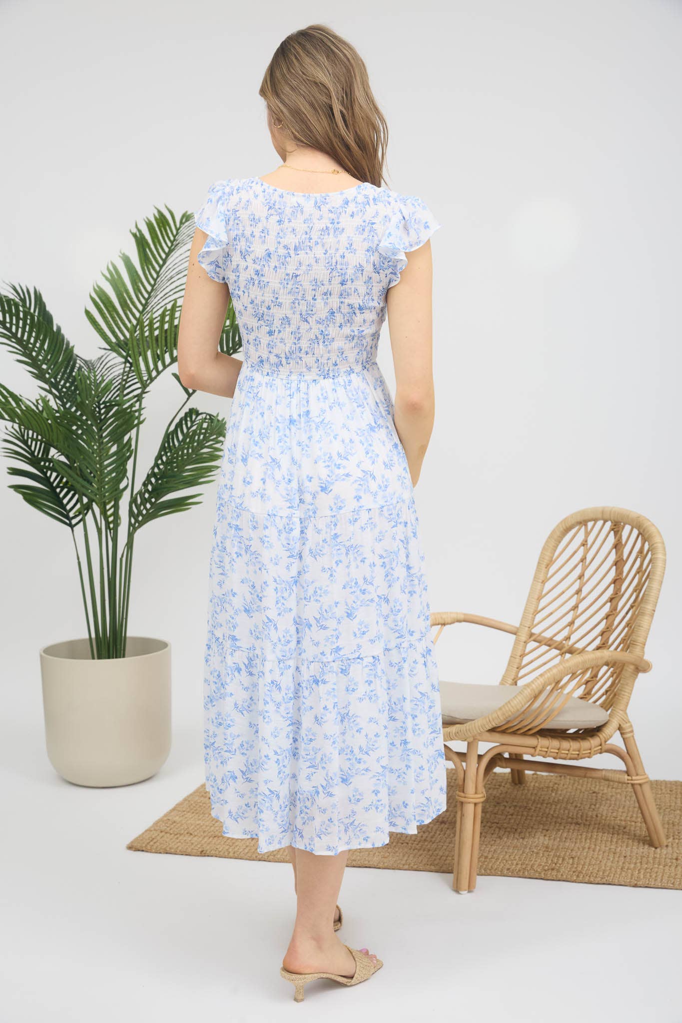 This midi floral pattern dress is perfect for spring and summer. The V Neckline, ruffle sleeves and smocked A-line looks great on anyone.