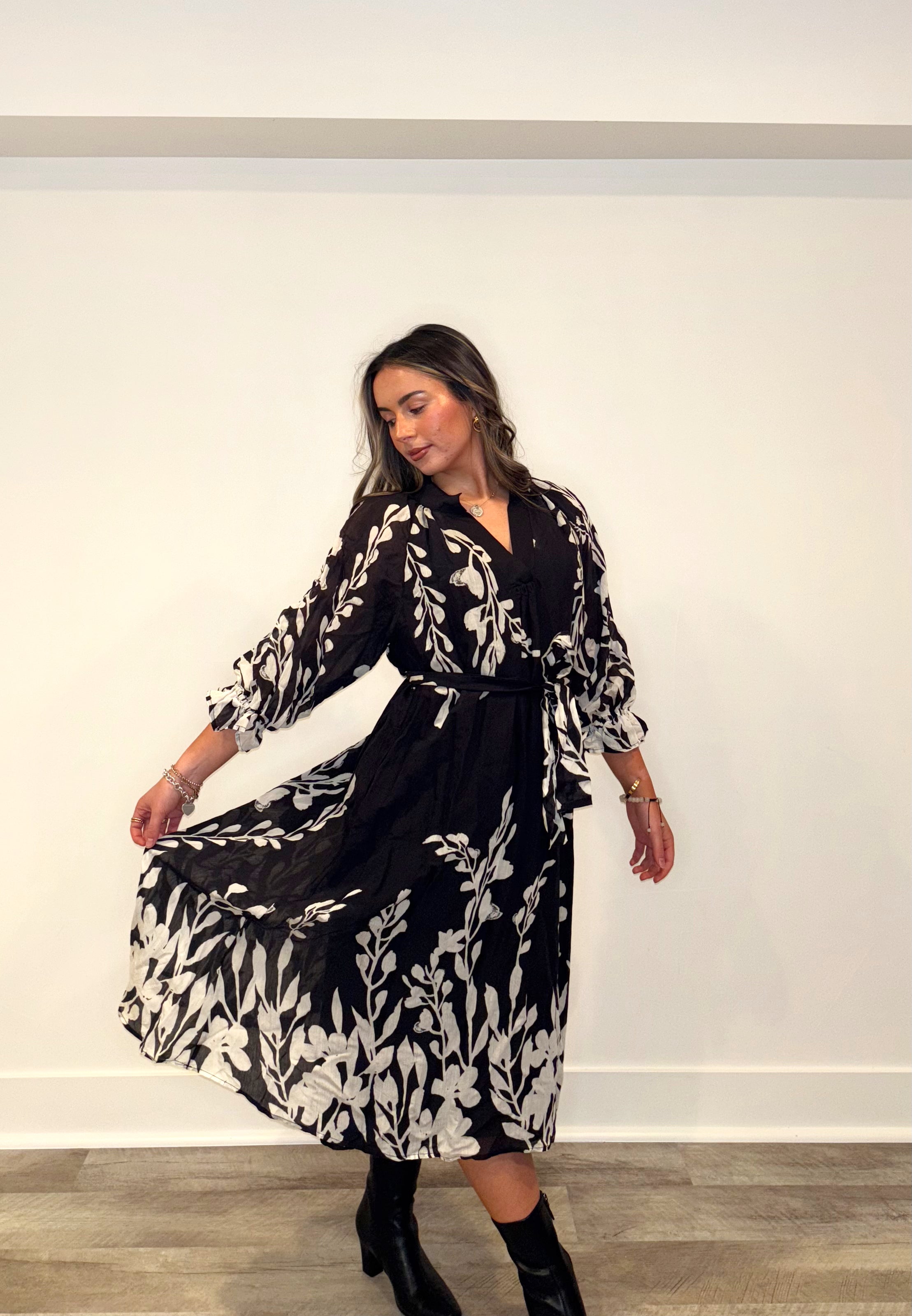 The Chloe Fall Dress by Umgee showcases refined craftsmanship with its striking black base and intricate white floral motif. The integrated belt defines the waist with precision, creating a polished silhouette ideal for layered styling. Complete with a quality lining, this dress delivers both durability and comfort. A versatile wardrobe essential that transitions seamlessly from professional settings to casual gatherings throughout the season.