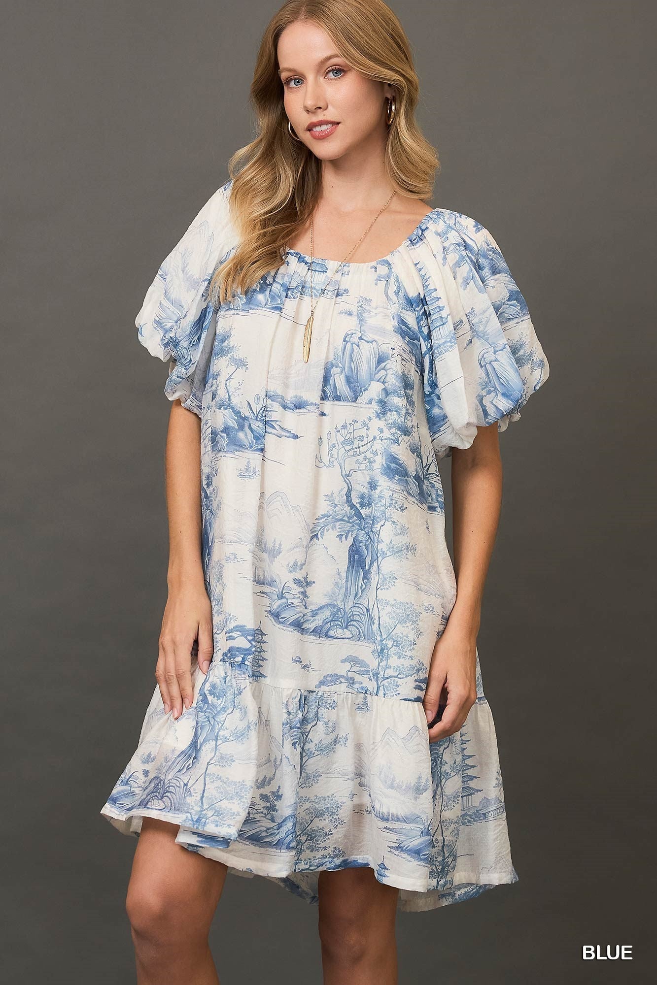 50% OFF - This toile print dress is perfect for any summer occasion. The puff sleeves and slight ruffle at the bottom give this dress a romantic look that will look great on anyone. The dress is fully lined.