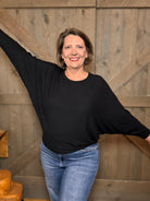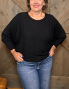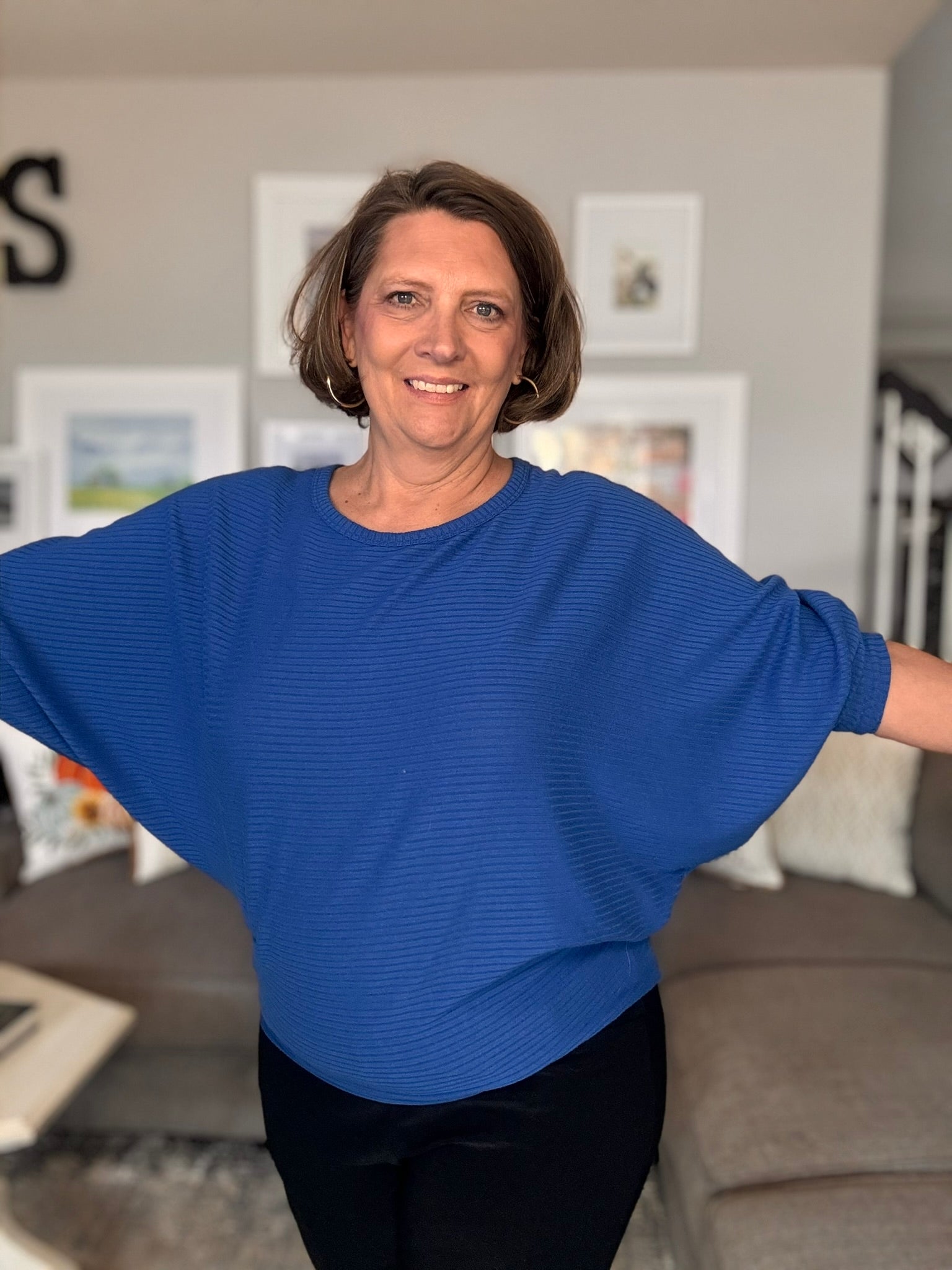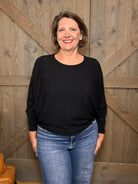 The Kenzie sweater features a ribbed batwing design with a boat neck, offering a relaxed and comfortable fit. With an approximate total body length of 24.5 inches and a generous bust measurement of 69 inches (based on a small size), it drapes effortlessly for versatile styling. This piece combines casual elegance with practical comfort for year-round wear.