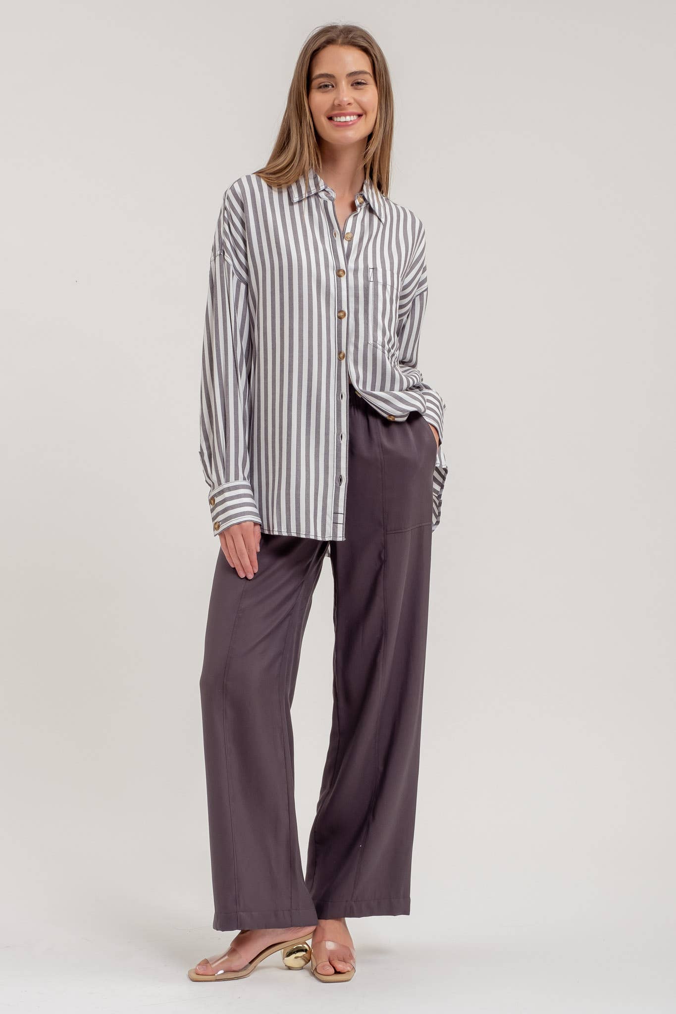 This relaxed-fit collared button-down long sleeve shirt combines classic style with everyday comfort. Its breathable fabric and tailored cut provide ease of movement while maintaining a polished look, making it ideal for both casual and professional settings. The timeless stripe pattern adds subtle sophistication, ensuring versatility in your wardrobe.