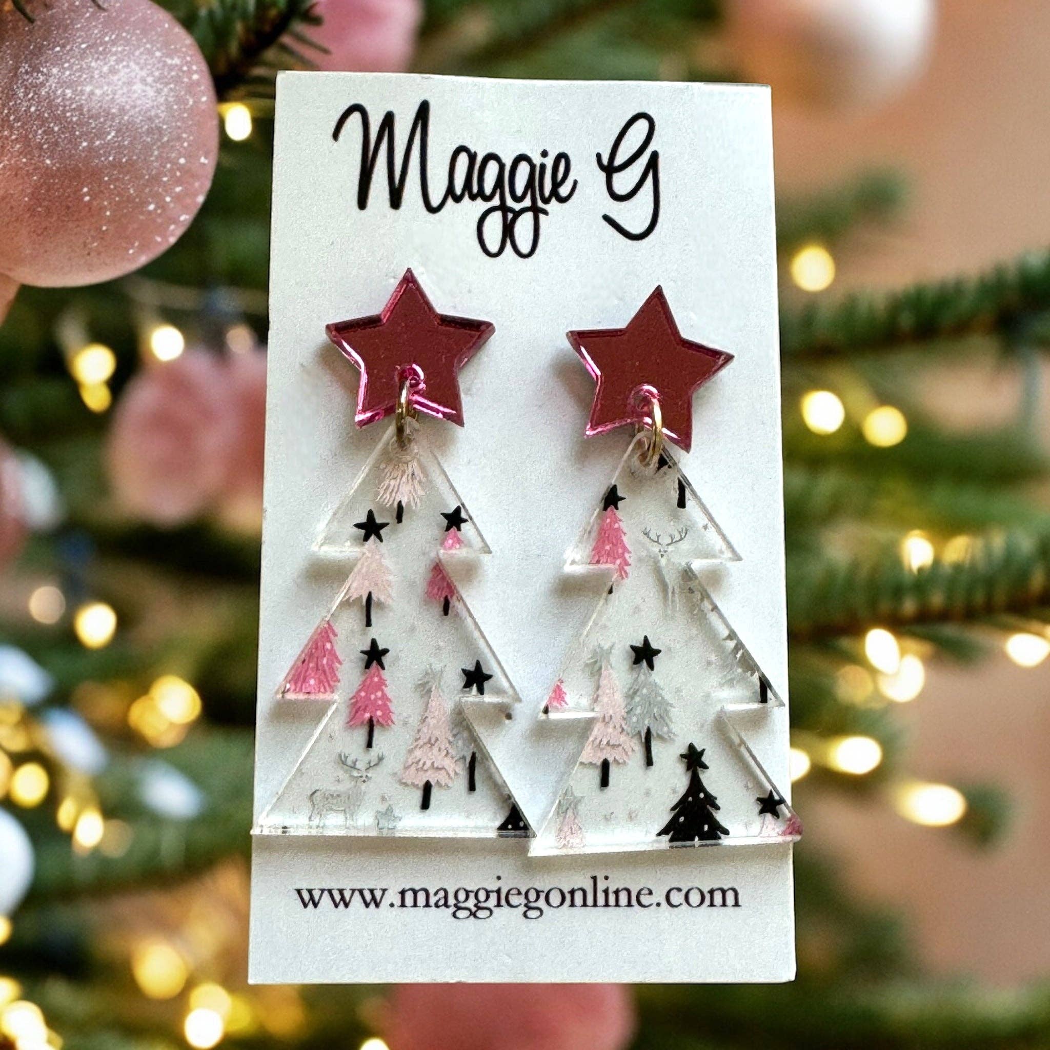 Celebrate the season with these charming handmade Christmas tree earrings in pink. Each pair is laser-cut and hand-assembled with premium acrylic and resin, delivering lightweight comfort for all-day wear. Nickel-free and lead-free findings ensure worry-free styling. Perfect for holiday gatherings or as a thoughtful gift, these statement earrings add festive flair to any outfit. Handcrafted with care, slight variations make each pair uniquely yours.
