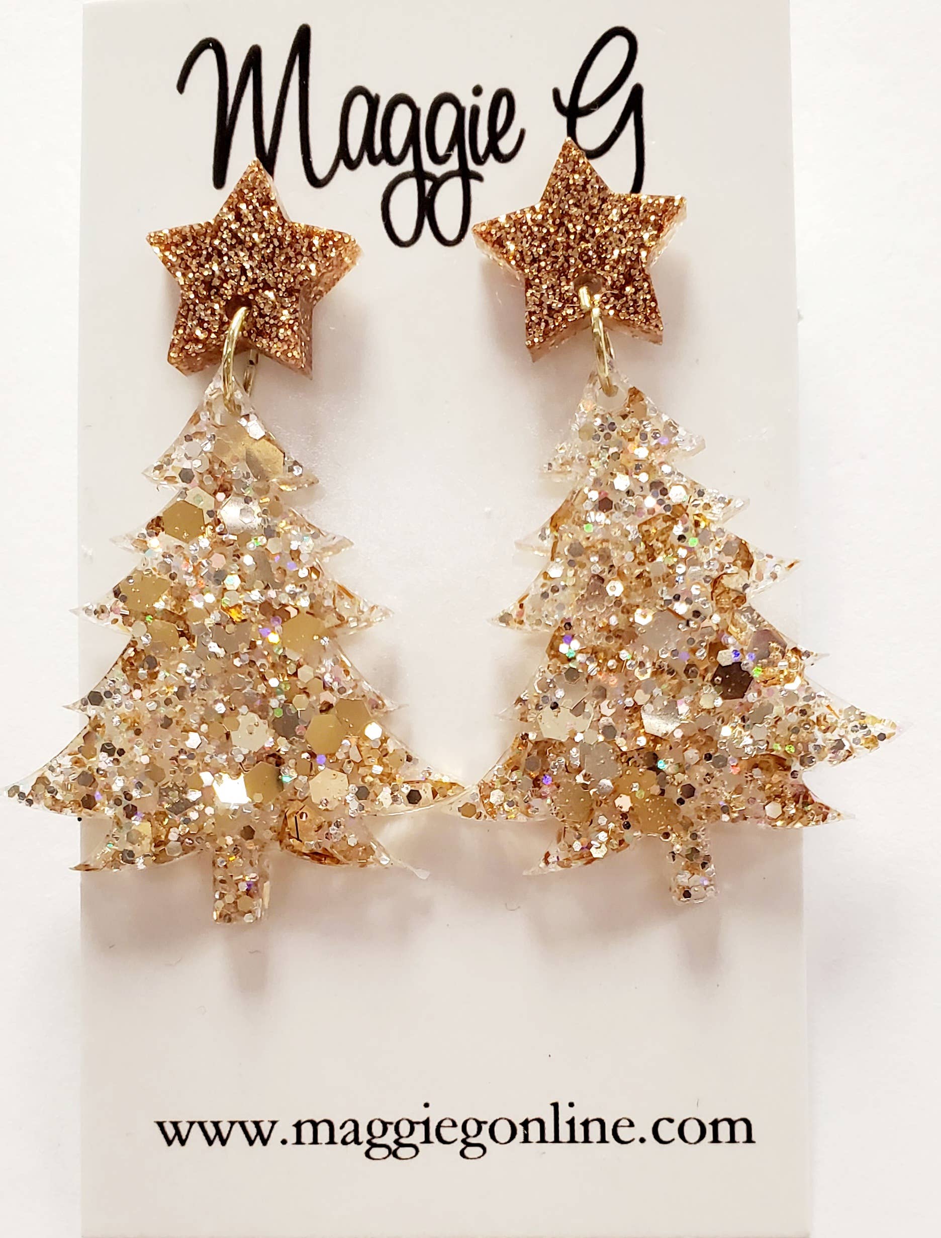 Celebrate the season with our Christmas Tree Gold Resin Earrings—handcrafted statement pieces that bring festive charm to any outfit. Each pair is laser cut and hand assembled using premium acrylic and resin, then finished with nickel-free, lead-free findings for safe, all-day wear. Lightweight and comfortable, these earrings measure approximately 1.35" x 2.10", making them the perfect size for eye-catching holiday style. Since each pair is individually made by hand, you'll appreciate the unique character and slight variations that come with authentic handmade jewelry. Ideal for holiday parties, gift-giving, or treating yourself to something special this season.