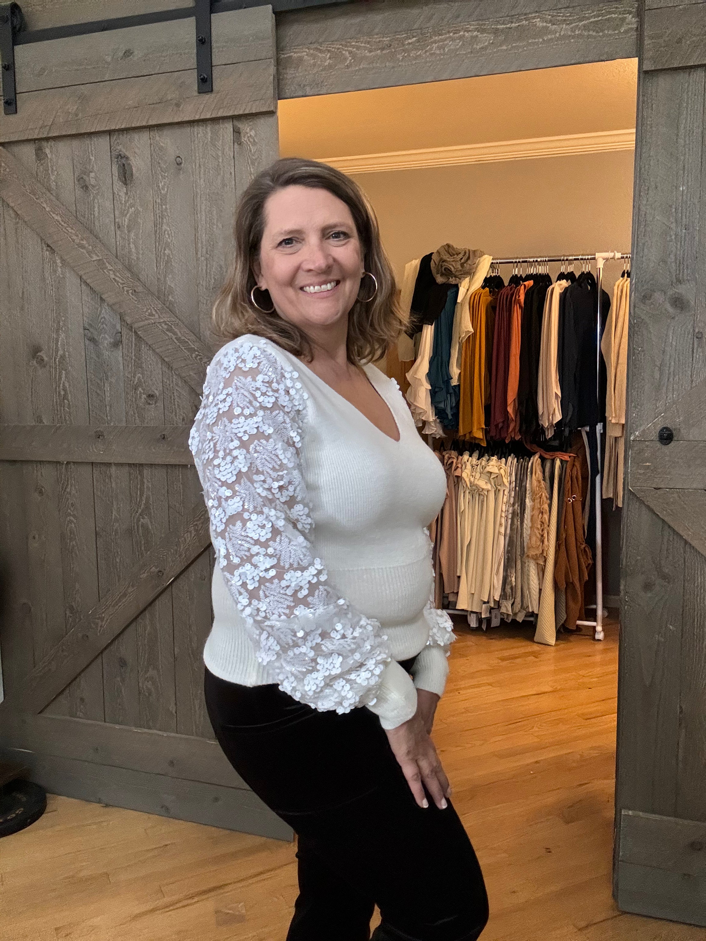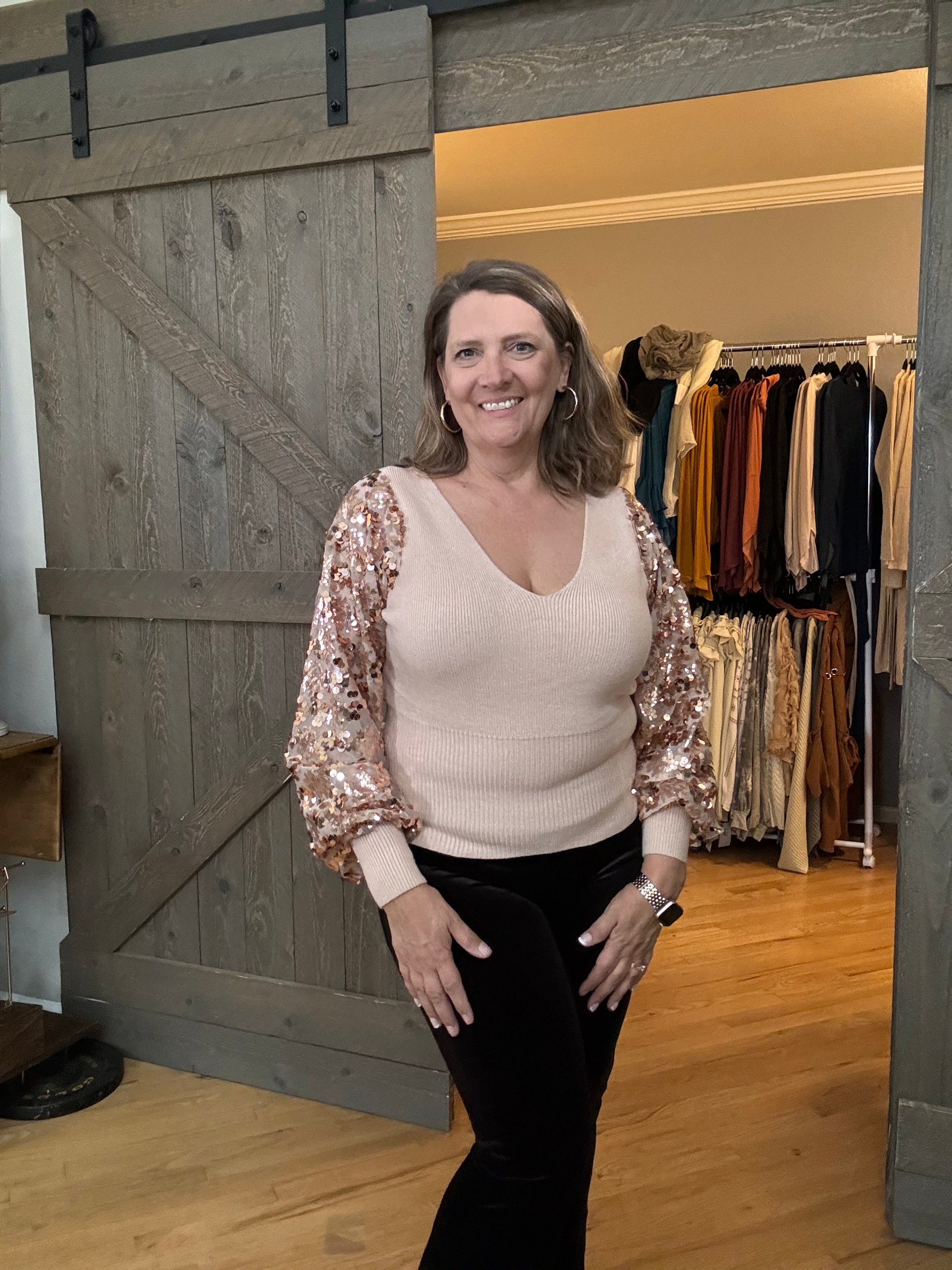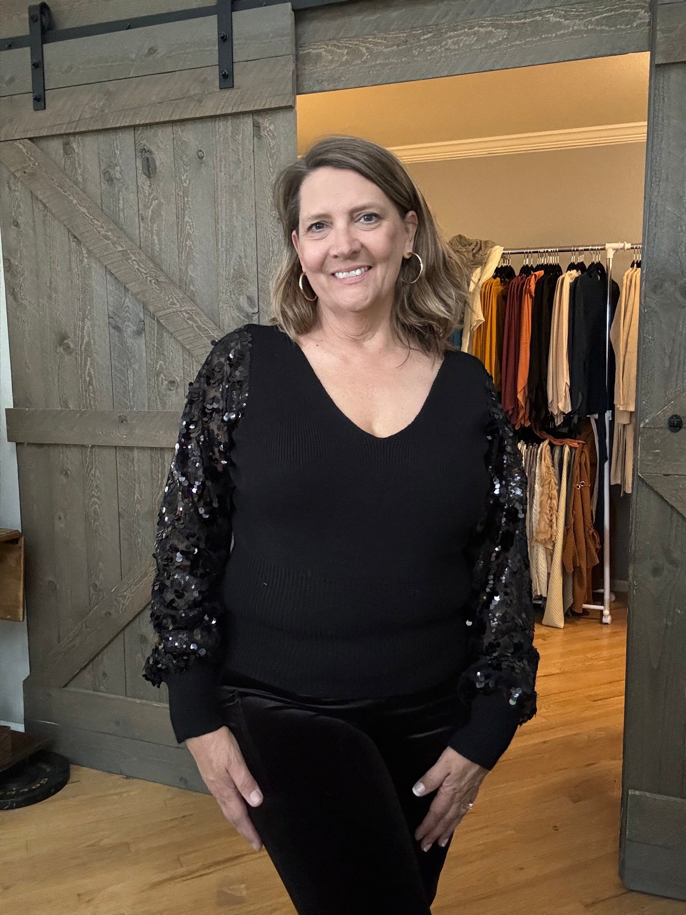 The Liesel sweater is PERFECT for Christmas, New Year’s parties and any night out! The flattering v-neck design works perfectly with the embroidered sequins on mesh sleeves. The ribbed cuff on the sleeves and hem gives it an elevated look!