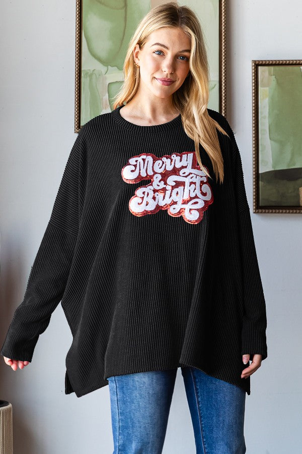 You will be Holidays ready in this urban ribbed shirt. The sequin "Merry & Bright" will feel festive paired with joggers, jeans, leggings or whatever bottom you choose. It is available in Red and Black. This round neck shirt is made of 95% polyester and 5% spandex to give it a little stretch. It features a dolman sleeve and side slit at the hip giving it little extra details to elevate this top.