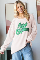 Say Merry Christmas in style in this cream urban ribbed top with a sequin patch.  It features a round neck and a long puff sleeve for an elevated look.  This top would be great paired with leggings, joggers or jeans.  You will spread Christmas cheer wherever you go in this top.