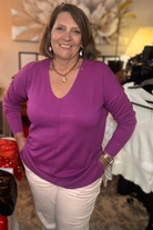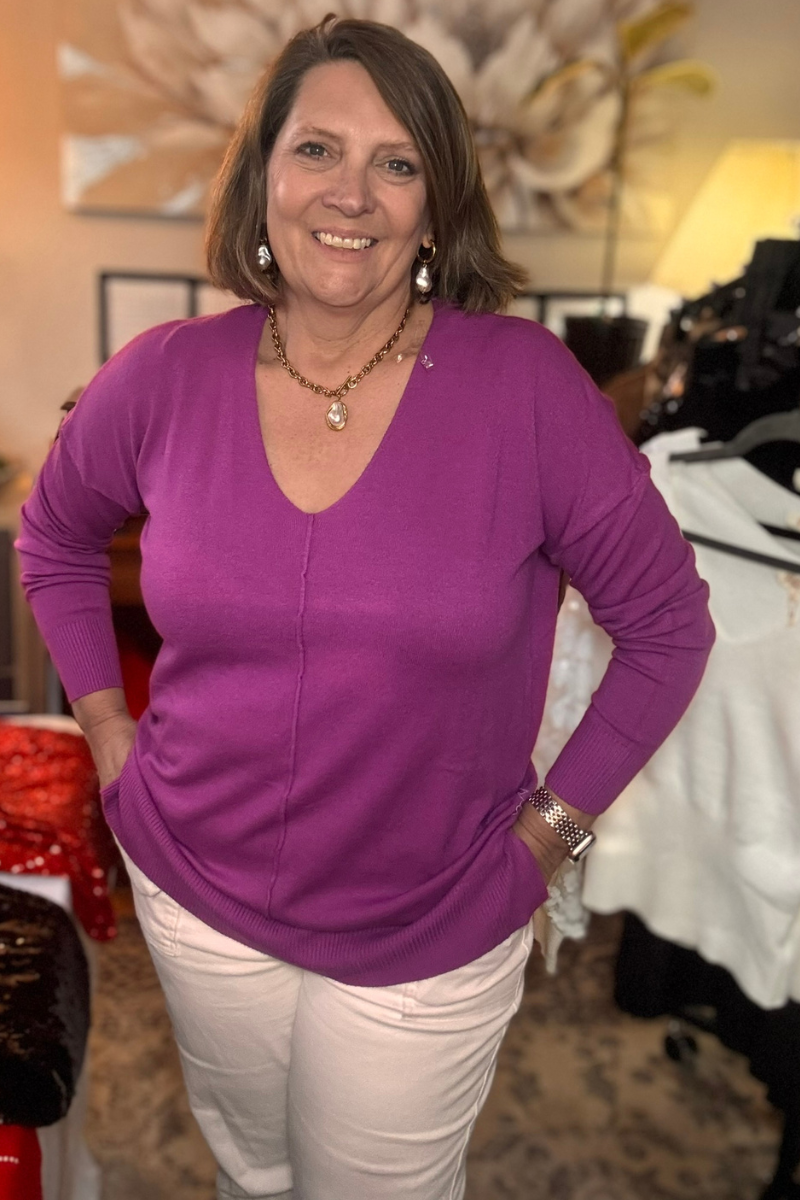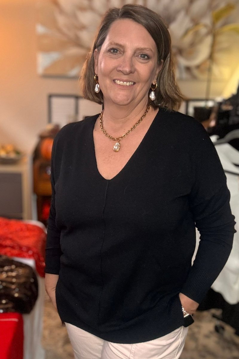 Elevate your seasonal style with the Shannon Sweater, a versatile layering essential designed for effortless sophistication. The flattering V-neckline and relaxed silhouette create a comfortable, modern look, while distinctive front seaming adds visual interest. Finished with ribbed cuffs and hem for a polished appearance, this piece transitions seamlessly from fall into winter. Crafted from a luxurious blend of 50% viscose, 28% nylon, and 22% polyester for a soft, breathable feel. Available in S/M with a 27" total body length.