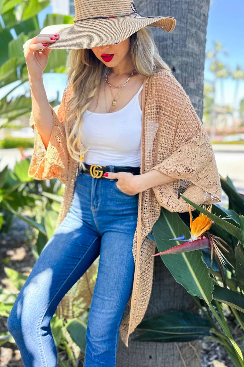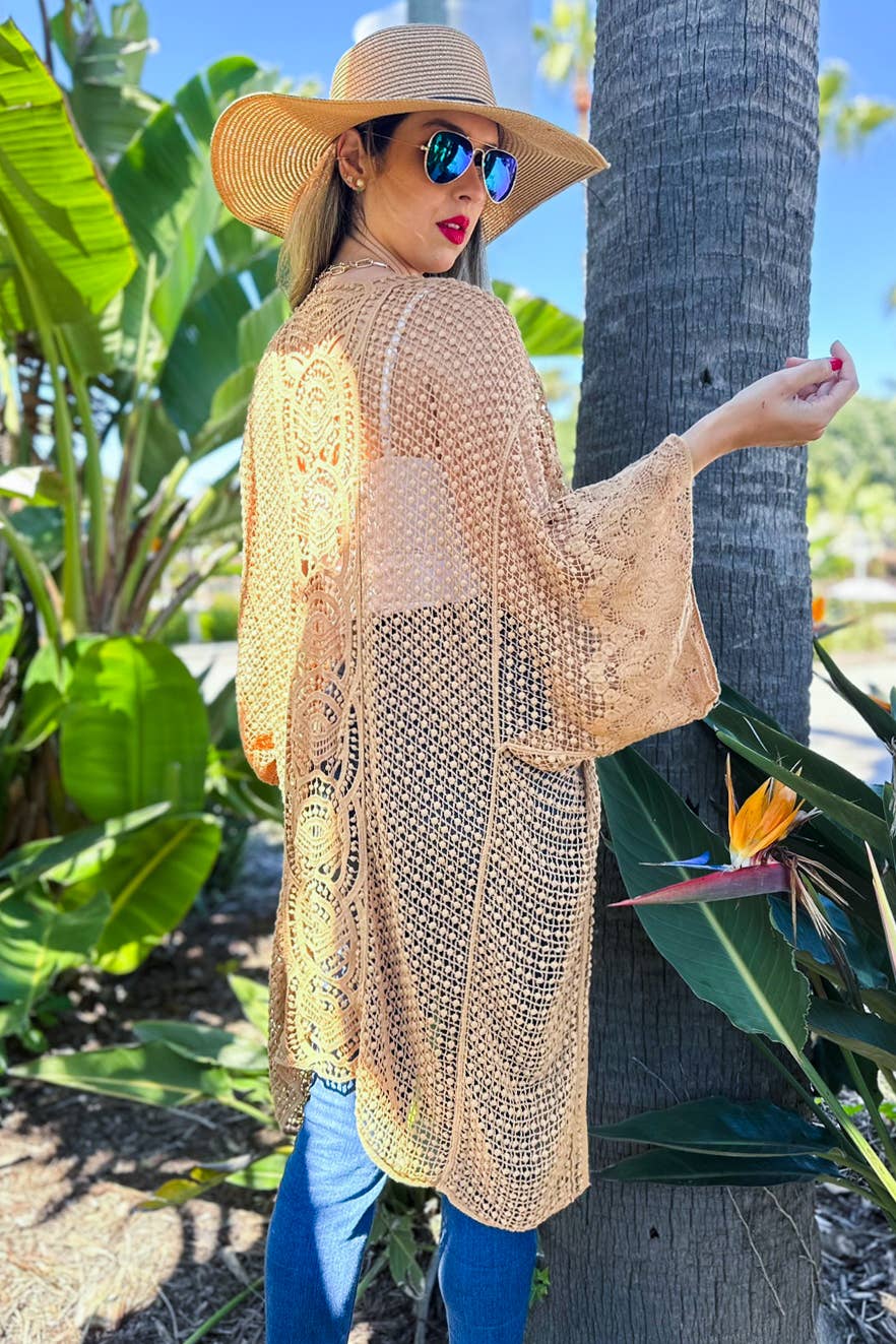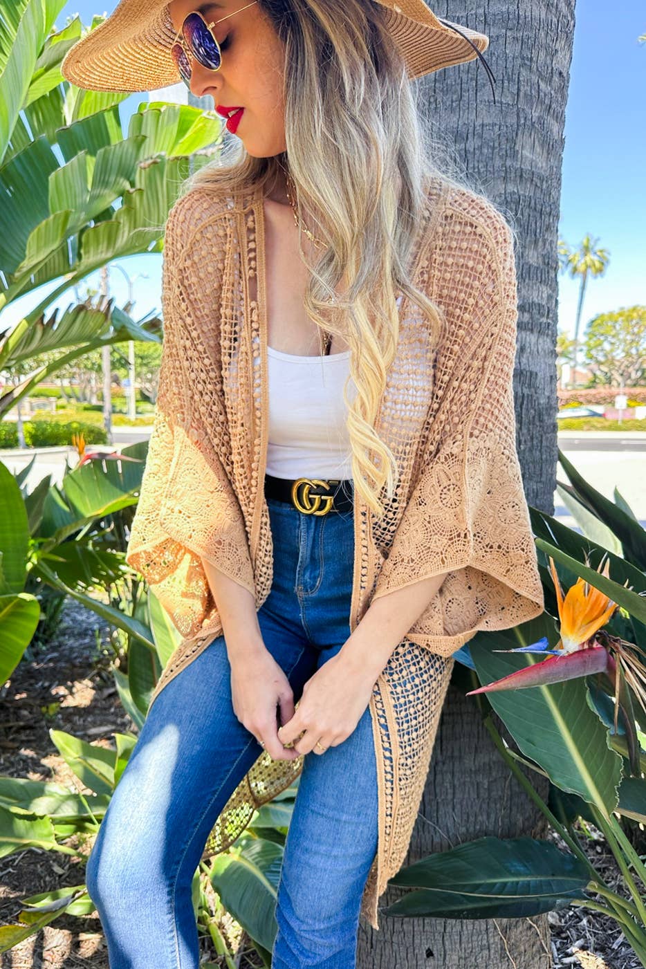 Enhance any outfit with this camel color Floral Pattern Crochet Kimono. The wide sleeves give this kimono a flattering look.