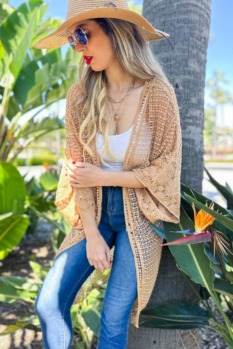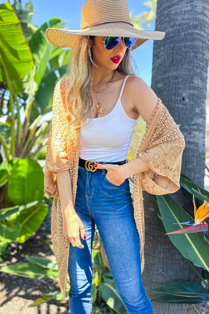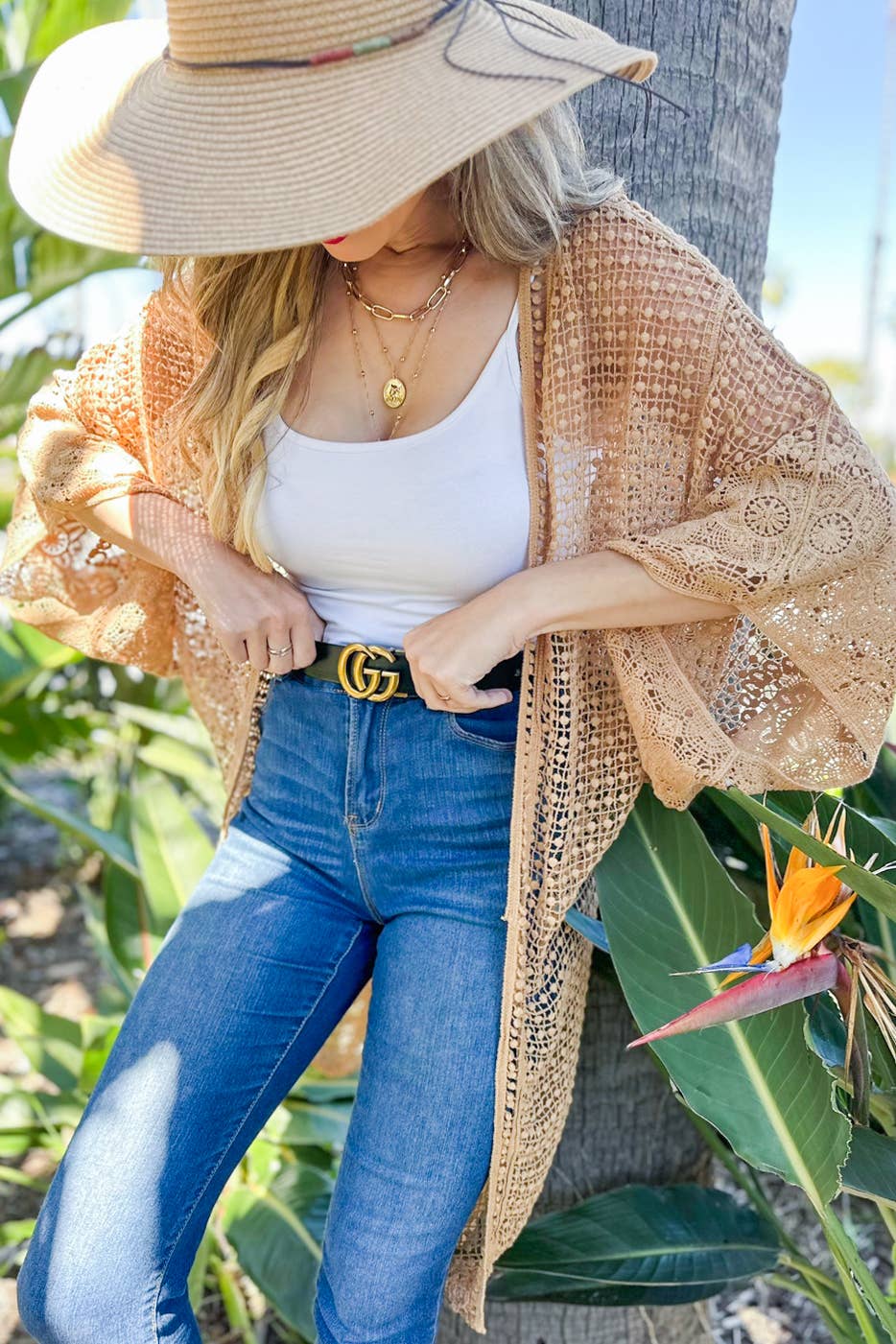 Enhance any outfit with this camel color Floral Pattern Crochet Kimono. The wide sleeves give this kimono a flattering look.