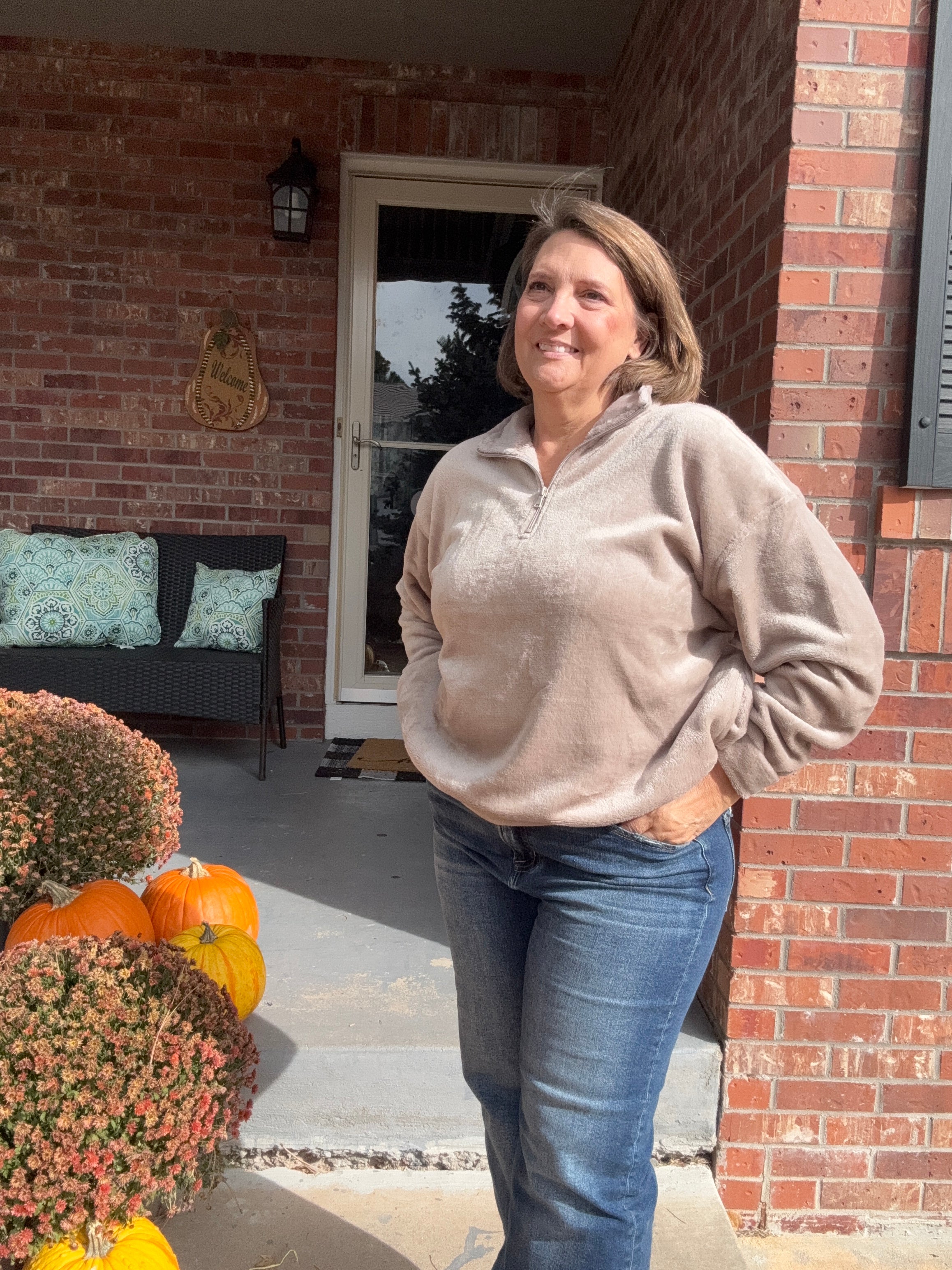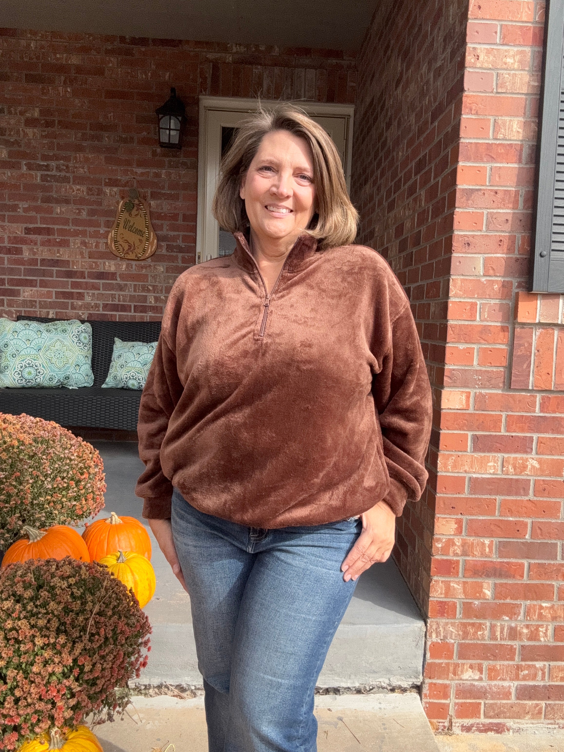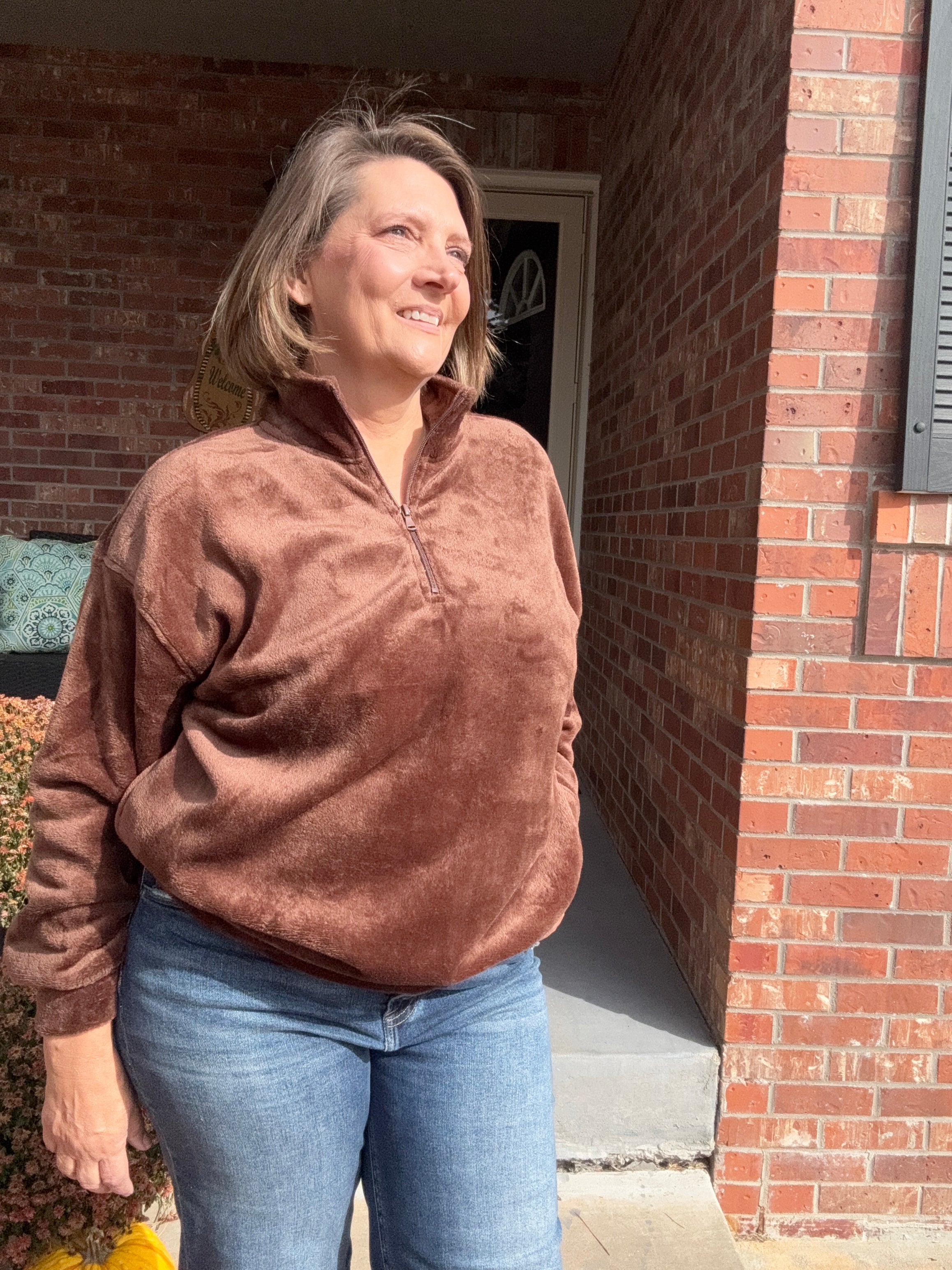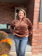Embrace cozy sophistication with this oversized 1/4 zip pullover, crafted from luxuriously soft furry fabric that delivers warmth without bulk. The relaxed fit provides effortless layering versatility, while the quarter-zip design allows easy temperature adjustment throughout your day. Perfect for casual outings or relaxed evenings, this piece combines comfort with contemporary style—a wardrobe essential that transitions seamlessly from season to season.