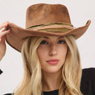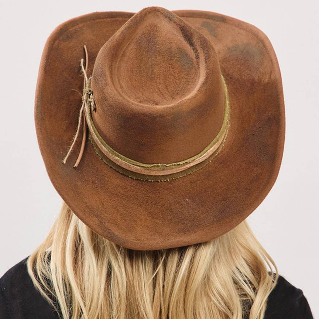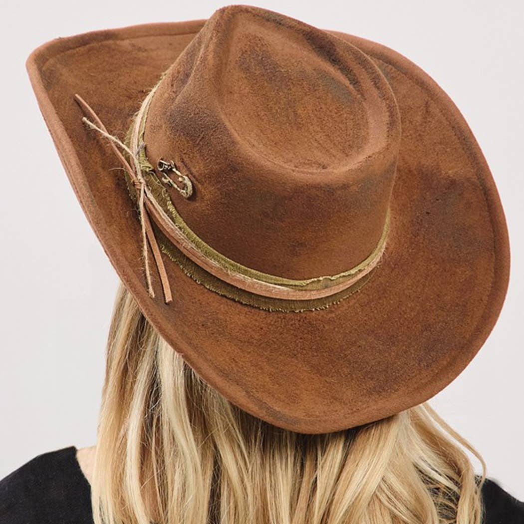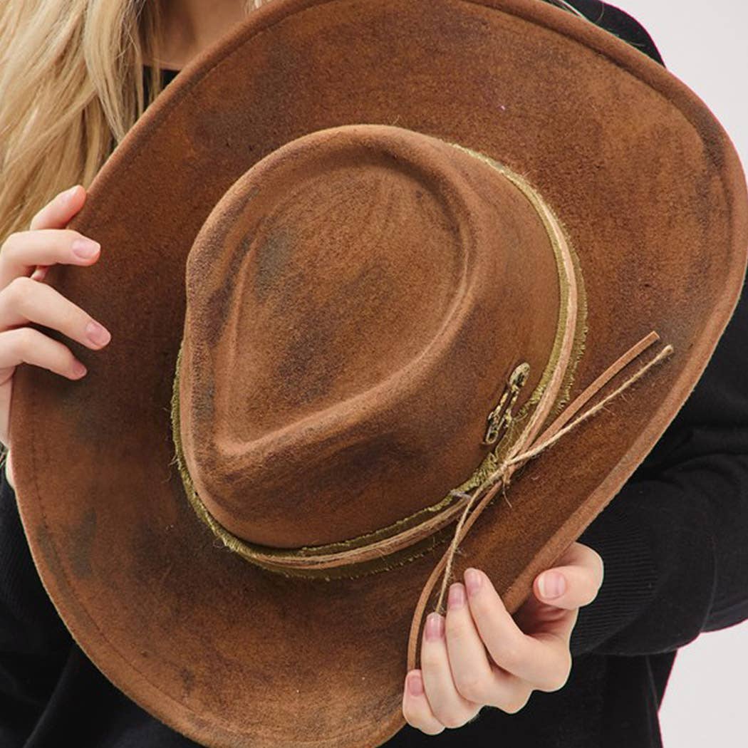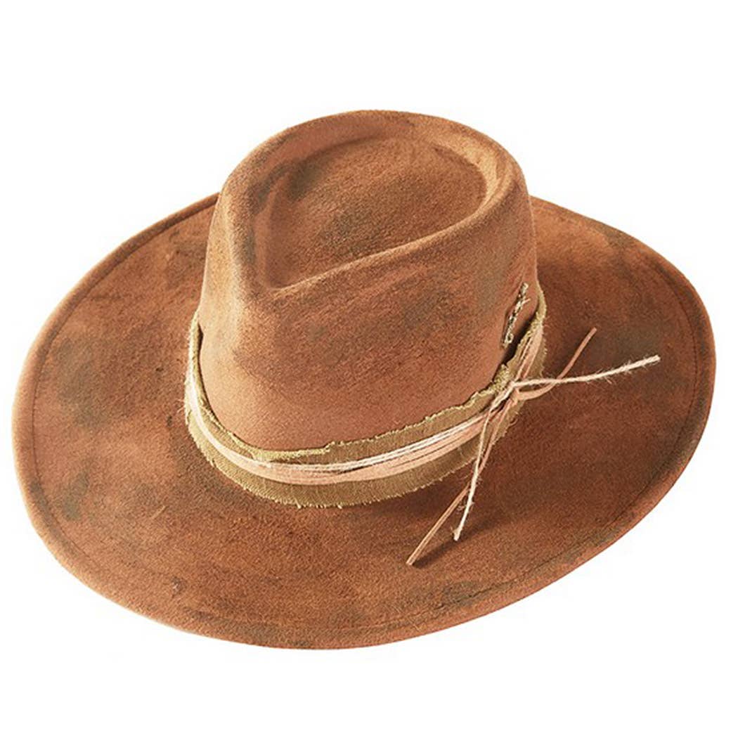 This vintage-inspired shapeable hat merges cowgirl and fedora aesthetics with distressed polyester fabric and a textured suede band for authentic rustic appeal. The metal accent detail and moldable crown let you customize the fit and silhouette to match your personal style. One size fits most, making it an accessible choice for anyone seeking that coveted Western edge. Ideal for festivals, casual outings, or layering into your everyday wardrobe with effortless sophistication.